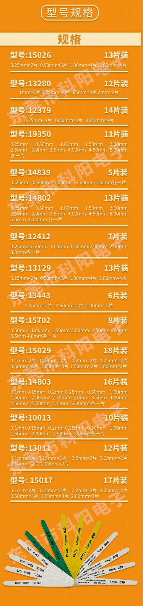 厚度:0.25mm=3片 0.50mm=3片 1.00mm=8片